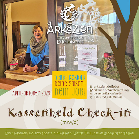 Im Eingangs- und Kassenbereich bist du das erste Gesicht der verwunschenen Erlebniswelt ArkaZien. Mit deiner offenen, serviceorientierten Art sorgst du dafür, dass sich unsere Gäste vom ersten Moment an willkommen fühlen und ihr Besuch entspannt, fröhlich und voller Vorfreude beginnt.